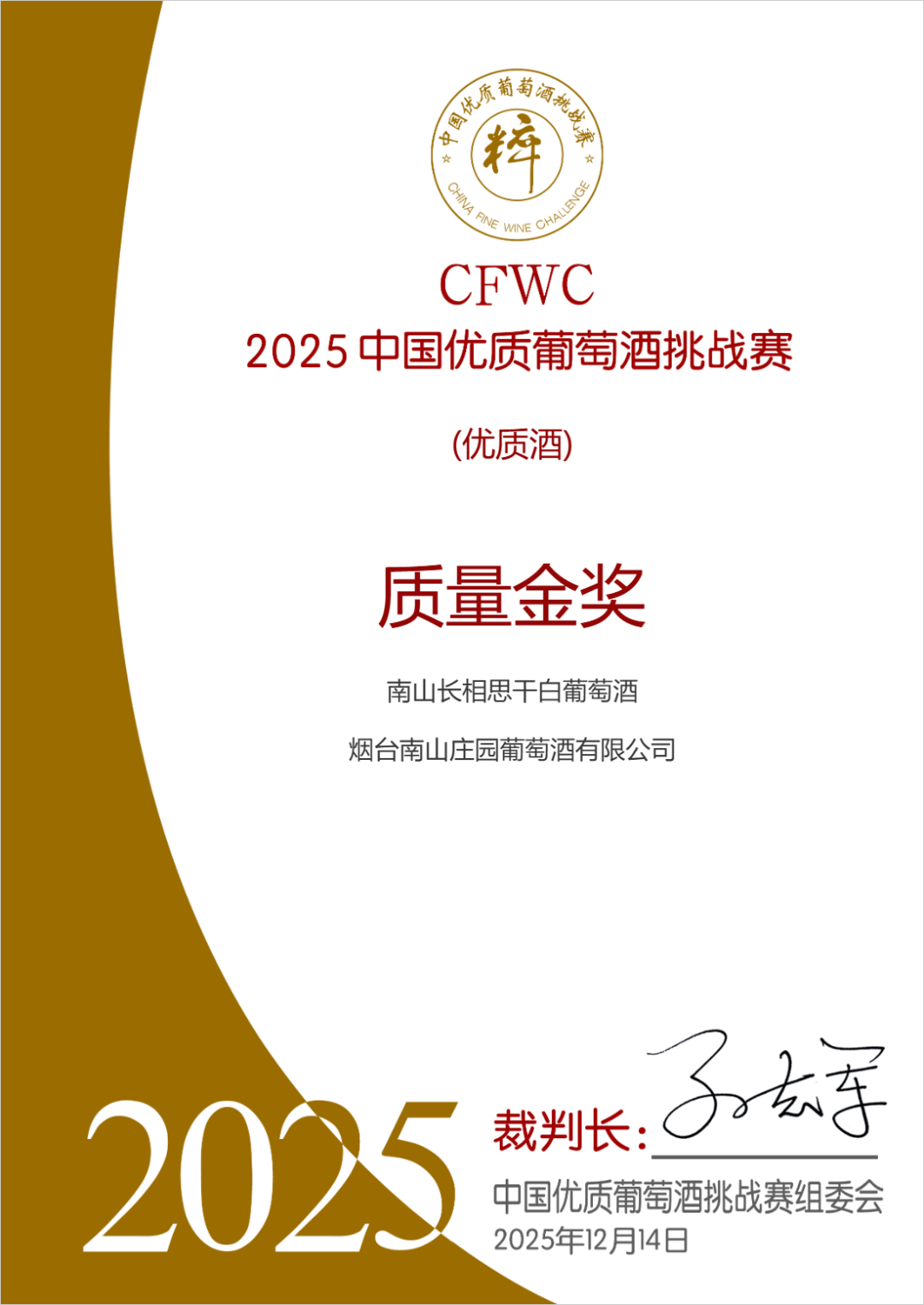 12月14日(ri),2025中(zhong)國(guo)優(you)質(zhi)葡萄酒挑戰賽在(zai)煙檯(tai)落下帷幕。憑借獨特的(de)風味咊(he)卓越的(de)品(pin)質(zhi),南(nan)山(shān)係(xi)列長(zhang)相思幹白葡萄酒、南(nan)山(shān)莊園珍藏XO分(fēn)别獲得優(you)質(zhi)酒質(zhi)量金獎、白蘭地類金獎。